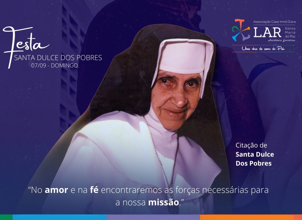 O LAR Santa Maria da Paz tem a alegria de convidar toda a comunidade para participar da Festa em Honra a Santa Dulce dos Pobres, nossa copadroeira, que acontecerá no dia 07 de setembro de 2025.